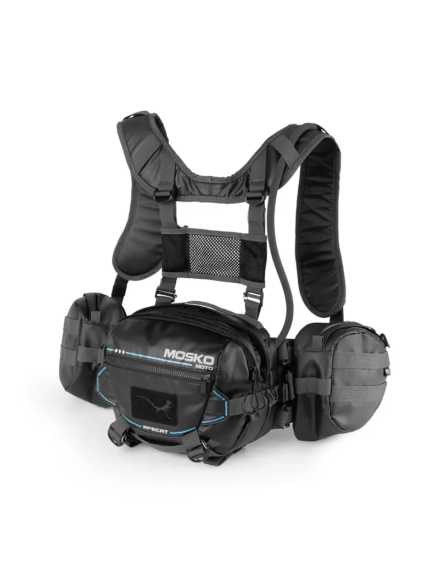 El arnés Apecat  fue diseñado para ser un sistema de transporte ultra cómodo y adaptable, con un depósito de agua Hydrapak® de 3.0 litros (100 oz) y manguera de hidratación aislada. El Apecat puede usarse como una riñonera minimalista, con solo el compartimento central principal, o ampliarse con bolsillos laterales y una correa de hombro completa para mayor sujeción. Añade el soporte de pecho Wildcat para acceder rápidamente al almacenamiento frontal y maximizar la capacidad del Apecat. DISEÑO Se puede usar sobre un maillot, una protección externa o una chaqueta de aventura grande. El Apecat ofrece un amplio rango de ajuste y distribuye uniformemente el peso del depósito de 3.0 L, las herramientas y tus objetos esenciales. El Apecat ofrece una amplia organización, materiales resistentes a la intemperie y máxima comodidad para la conducción todoterreno y de senderos. El Wildcat Chest Rig opcional se combina con la riñonera Apecat de 9 litros. El Wildcat Chest Rig cuenta con dos bolsillos frontales, uno diseñado para facilitar el acceso y el transporte seguro de un comunicador satelital, como el Garmin inReach o el InReach Mini. Al abrir el bolsillo principal, encontrará un panel de velcro extraíble con correa elástica para guardar objetos pequeños como una navaja o cables de carga, además de espacio para guardar su teléfono, billetera, refrigerios u otros artículos de acceso rápido sin tener que quitarse la mochila. El panel trasero del Chest Rig también cuenta con MOLLE para conectarlo a otras bolsas o maletas Mosko con paneles MOLLE.   CARACTERÍSTICAS