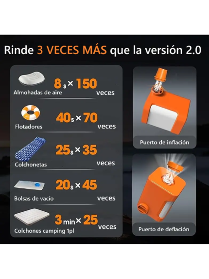 - Velocidad de inflado: 260L/min, infla colchones y equipos de camping en segundos.